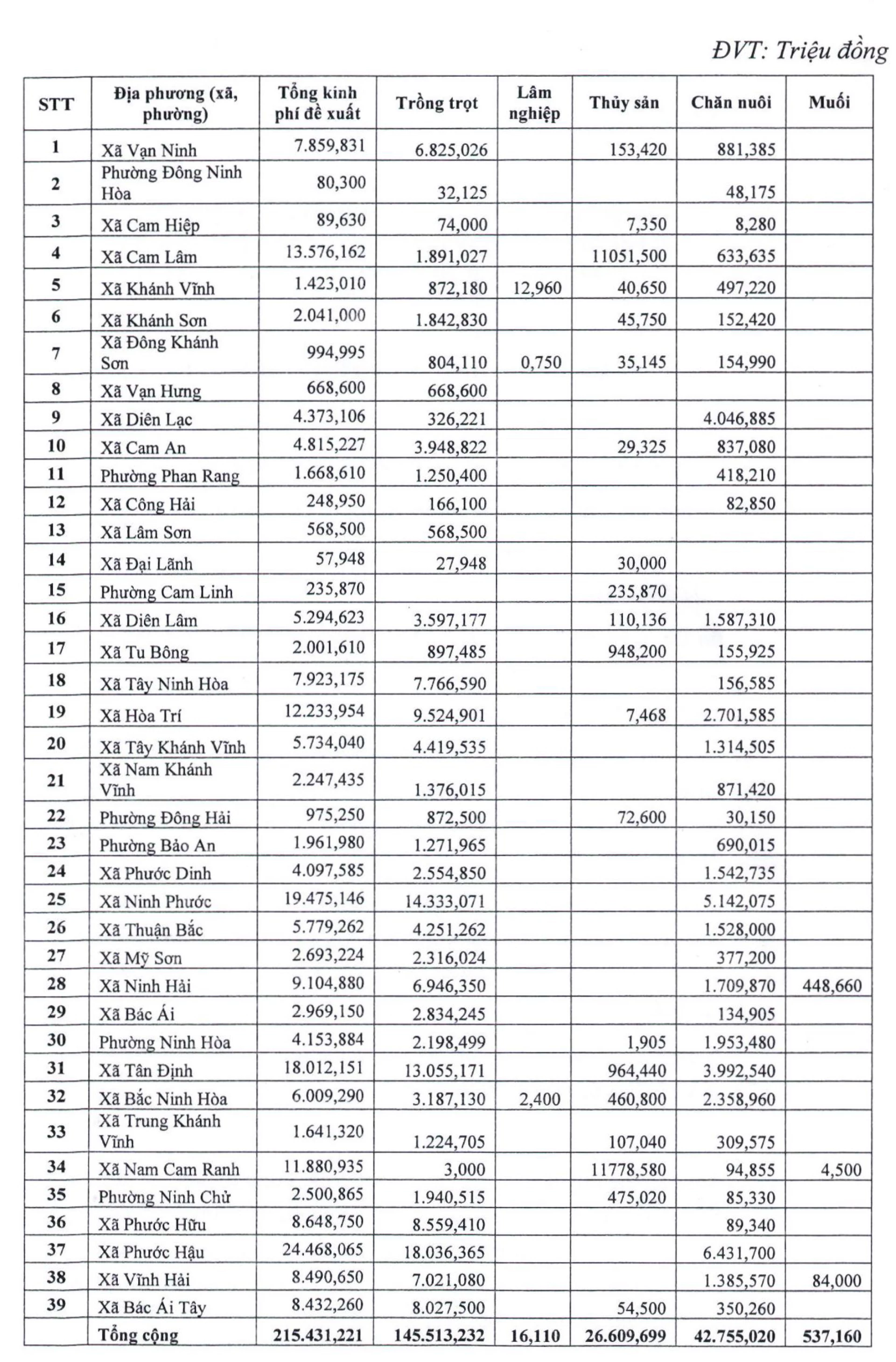 | Chi tiết theo dõi bảng kê kinh phí cần hỗ trợ do các địa phương đề xuất (đơn vị tính: triệu đồng) |