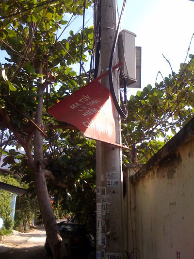 Bảng tuyên truyền về hiểm họa của ma túy trên đường Sử Hy Nhan (phường Vĩnh Hòa, Nha Trang) đang trong tình trạng cong vẹo (xem ảnh), không đọc rõ nội dung nếu không đến gần. Đề nghị tổ dân phố khắc phục để công tác tuyên truyền hiệu quả hơn.