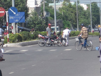 Lúc 9 giờ 25 ngày 31-10, tại đường 23-10 thuộc phường Ngọc Hiệp (TP. Nha Trang), đoạn đối diện đường vào Trường THPT Hà Huy Tập, có 3 người đàn ông ngang nhiên dựng 2 xe máy giữa đường...