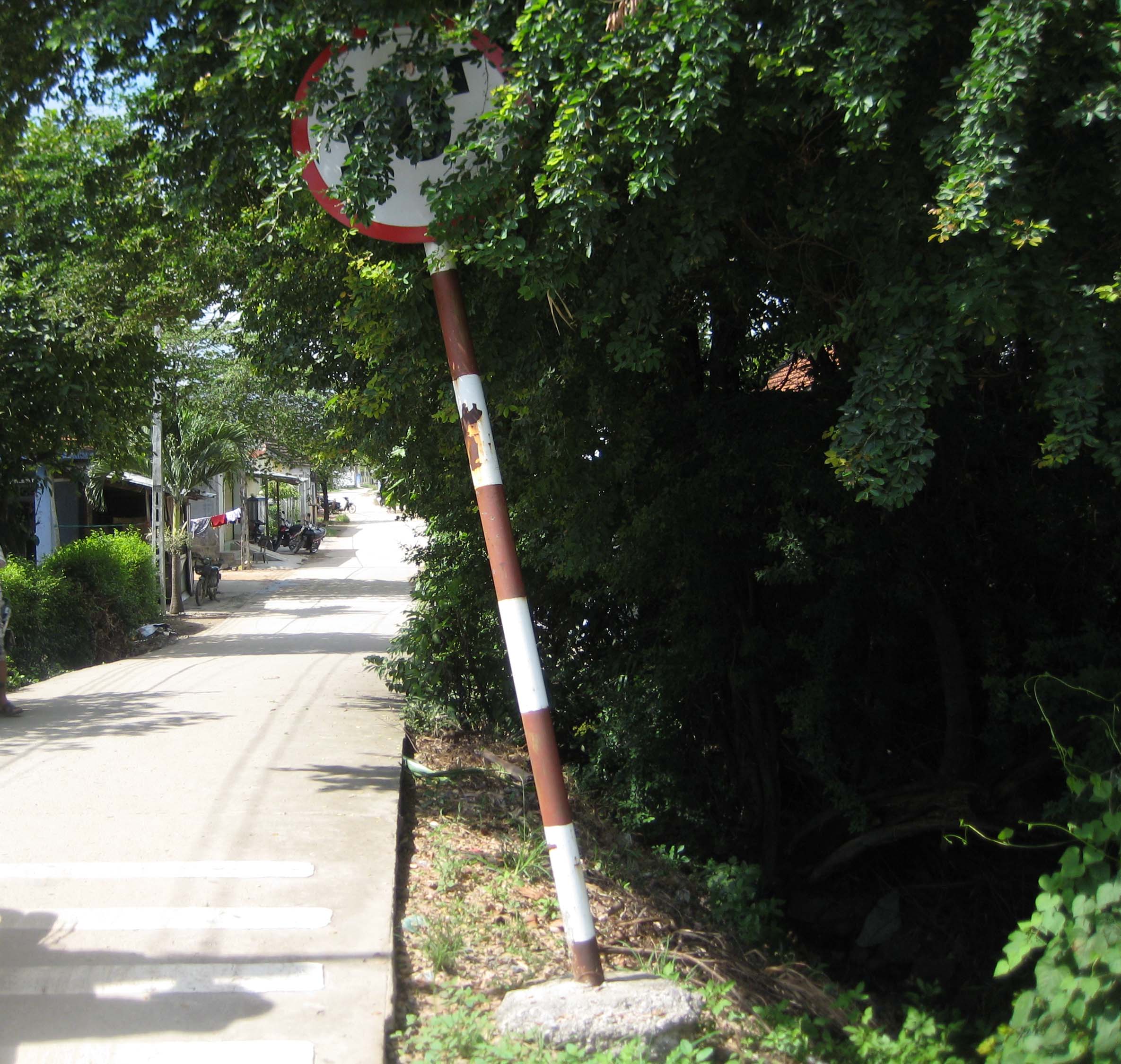 Tuy nhiên, 2 biển báo này không còn tác dụng vì một biển bị nghiêng, cây che khuất còn biển kia thì bị ngã vào tường rào. Đề nghị cơ quan chức năng sớm khắc phục.