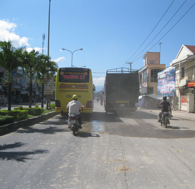 Cuối năm, số lượng xe chở hàng hóa và hành khách khá đông. Để rút ngắn thời gian đi lại, nhiều chủ phương tiện đã phóng nhanh vượt ẩu (xem ảnh xe tải vượt phải trên đường Lạc Long Quân, thị trấn Diên Khánh), rất nguy hiểm.