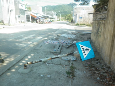 Hiện nay, trên đường Ngô Văn Sở và đường Triệu Quang Phục (TP. Nha Trang) có 2 biển báo hiệu dành cho người đi bộ lưu thông nhưng đã bị gãy nằm trên vỉa hè và bị nghiêng đổ, phía dưới bị xà bần bao quanh (xem ảnh 1, 2).