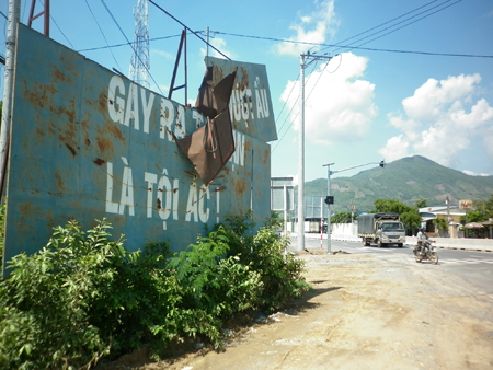 Hiện nay, tấm bảng tuyên truyền giao thông ở ngã ba Quốc lộ 1A - Nguyễn Xiển (TP. Nha Trang) đã cũ kỹ, bị sét gỉ, mất chữ (ảnh) trông rất nhếch nhác và không có tác dụng.