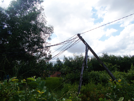 Hiện nay, toàn bộ trụ điện dẫn vào xóm 4, thôn Láng Nhớt (xã Diên Tân, huyện Diên Khánh) là cây tạm (ảnh). Sau nhiều năm sử dụng đã sà thấp, có thể xảy ra nguy cơ mất an toàn.