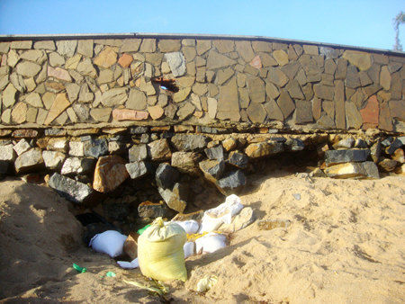 Bờ kè công viên Bạch Đằng, TP. Nha Trang có một đoạn dài gần 100m bị trơ phần chân móng, trong đó có nhiều chỗ bị sạt lở, tạo ra những hàm ếch phía dưới bờ kè.