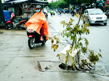 Hiện nay, trước cây xăng trên đường Điện Biên Phủ, TP. Nha Trang có nắp hố ga bị sụp bể tạo hố. Người dân cắm cây, thùng vào hố (ảnh) để cảnh báo nguy hiểm cho người tham gia giao thông.
