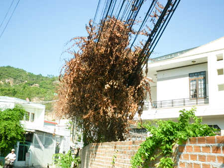 Trước nhà số 17A đường Dương Vân Nga, phường Vĩnh Hải, TP. Nha Trang có nhánh cây khô bao phủ dây điện, cáp viễn thông (ảnh), gây mất an toàn.