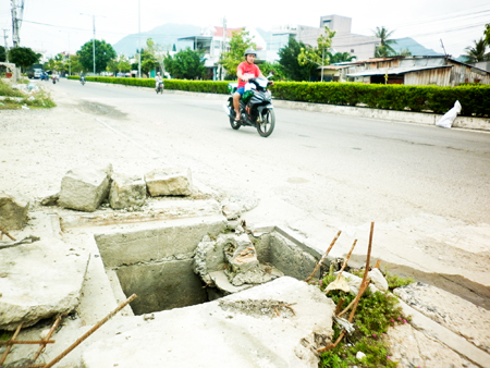 Tại ngã ba đường Nguyễn Trọng Kỷ - Phạm Văn Đồng, TP. Cam Ranh, có nắp hố ga bị bể nát, tạo thành hố sâu trên vỉa hè (ảnh). Người dân phải chặn đá để cảnh báo nguy hiểm.