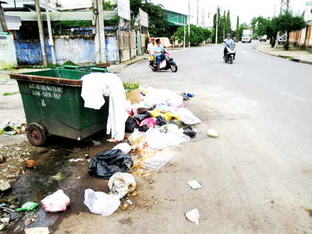 Trên đường Trường Sơn (gần đầu hẻm 81), TP. Nha Trang, đơn vị quản lý đã đặt hai thùng rác lớn để thu gom rác. Thế nhưng, người dân vẫn vô tư xả rác ra lòng đường, bốc mùi khó chịu và ảnh hưởng mỹ quan đường phố (ảnh).