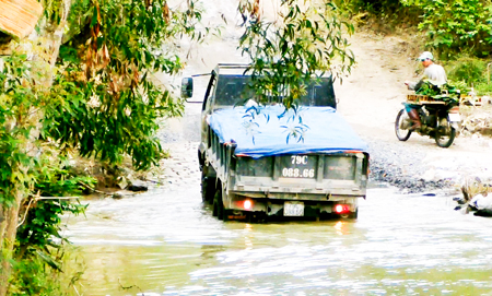 Hàng chục năm nay, đường liên thôn khu vực Đồng Sậy (thôn Cây Sung, xã Diên Tân, huyện Diên Khánh, Khánh Hòa) có đoạn phải băng qua suối rất rộng nhưng lại không có cầu. Mọi phương tiện, từ xe máy cho đến xe tải muốn đi qua buộc phải lội suối (ảnh) vì đây là đường duy nhất đi vào khu sản xuất của người dân và các mỏ khai thác đá. Người dân đã phải lót những tấm đan xi măng để giảm rủi ro.