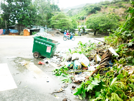 Tại ngã ba đường Thân Nhân Trung - Trần Khát Chân, phường Vĩnh Hòa, TP. Nha Trang có đặt thùng rác nhưng người dân lại thiếu ý thức bỏ rác bên ngoài (ảnh).