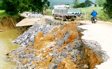 Sau những trận mưa lụt vừa qua, cầu Suối Khao nằm trên Tỉnh lộ 8 nối liền 2 huyện Diên Khánh và Khánh Vĩnh bị ảnh hưởng nghiêm trọng (ảnh). Đường nhựa dẫn lên đầu cầu bị sạt lở hoàn toàn, hiện nay được địa phương đổ đất để người dân lưu thông tạm. Tuy nhiên, phần đường tạm rất hẹp, khiến việc đi lại gặp nhiều khó khăn, nhất là các xe cơ giới vận chuyển hàng phục vụ Tết cho các địa phương miền núi. Rất mong cơ quan chức năng sớm cho sửa chữa lại phần đường dẫn để người dân lưu thông thuận lợi.