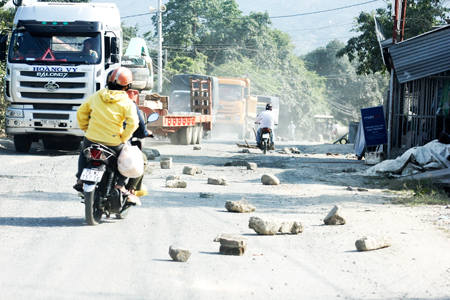 Hiện nay, người dân trên Tỉnh lộ 1 thuộc thôn Phước Điền, xã Phước Đồng, TP. Nha Trang xếp gạch đá trước nhà mình (ảnh), nhằm muốn các phương tiện giao thông phải đi chậm lại để hạn chế bụi vào nhà.