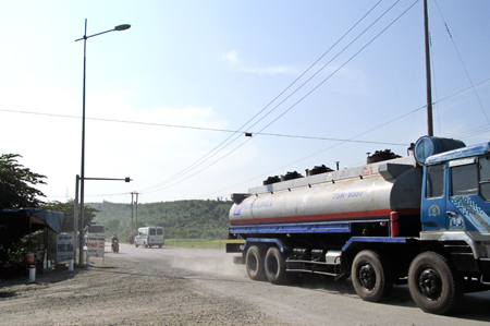 Hiện nay, tại điểm giao nhau giữa đường cầu Lùng - Khánh Lê và Hương lộ 62 (xã Diên Tân, huyện Diên Khánh) có một đoạn đường bị bong tróc do mưa lũ, đơn vị quản lý chỉ đổ đá cấp phối lưu thông tạm nên gây bụi mỗi khi xe tải đi qua (ảnh).