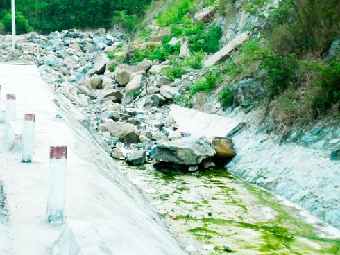 Do mưa lũ vừa qua, mương thoát nước nằm cạnh đường đi qua đèo Rù Rì, TP. Nha Trang bị đất đá từ trên núi tràn xuống nhưng đến nay chưa được nạo vét, thu dọn (ảnh), ảnh hưởng đến dòng nước chảy và hư hại bê tông mương.