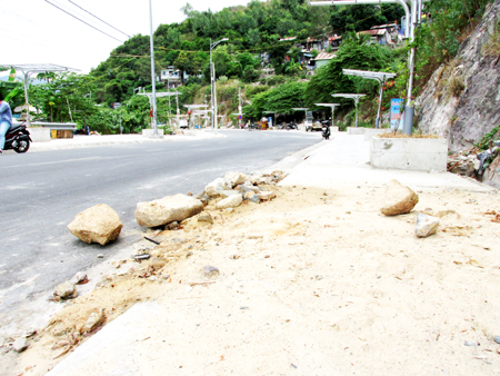 Hiện nay, trên lòng, lề đường Võ Thị Sáu, khóm Trường Hải, phường Vĩnh Trường, TP. Nha Trang có một đoạn bị đất đá từ trên núi rơi xuống, tiềm ẩn nguy hiểm cho người tham gia giao thông (ảnh).