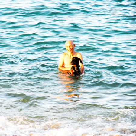 Vào các buổi chiều, người dân và du khách tắm biển Nha Trang rất đông. Vậy mà nhiều người còn đưa cả chó theo tắm biển chung với người (ảnh), điều này trái với nội quy công viên bờ biển Nha Trang.