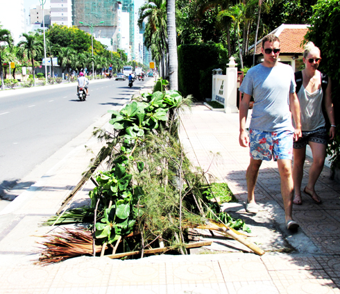 Mấy ngày nay, trên vỉa hè đường Trần Phú, gần cổng ra vào nhà hàng Ana Beach House, TP. Nha Trang có một nắp cống bị sập, tạo ra một hố miệng rộng, sâu ngang đầu người, người dân phải lấy cành cây cắm xuống hố để cảnh báo (ảnh).
