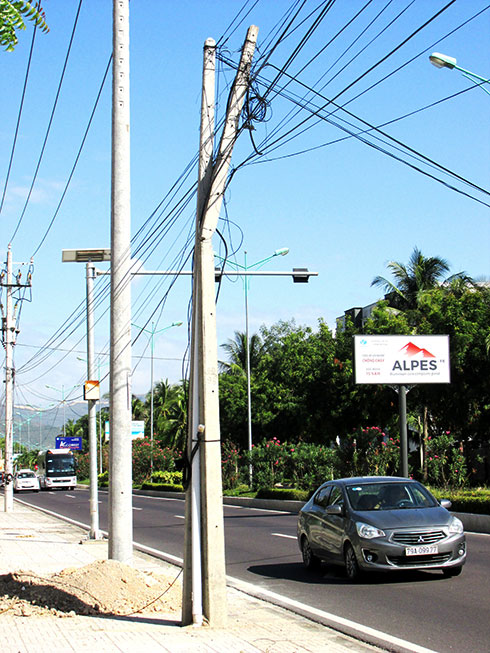 Hiện nay, tại hành lang an toàn Đại lộ Nguyễn Tất Thành, đoạn gần cổng ra vào Khu du lịch Diamond Bay Nha Trang, xã Phước Đồng, TP. Nha Trang có trụ cáp viễn thông bị gãy ngang thân và có thể đổ xuống đường bất cứ lúc nào, gây nguy hiểm cho người và các phương tiện tham gia giao thông (ảnh).