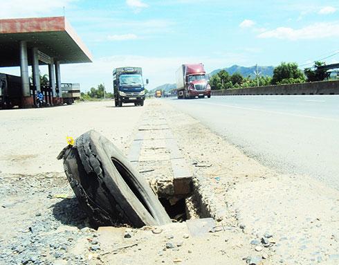 Hiện nay, trên Quốc lộ 1, đoạn trước cây xăng Trung Hòa, xã Suối Tân, huyện Cam Lâm, Khánh Hòa có nắp mương thoát nước bị sụp bể, lộ ra hố sâu. Để phòng ngừa tai nạn cho người tham gia giao thông, nhất là xe thường xuyên ra vào cây xăng, người dân lấy lốp xe để nơi miệng hố, cảnh báo nguy hiểm (ảnh). Mong cơ quan chức năng kiểm tra, khắc phục để bảo đảm an toàn và mỹ quan.