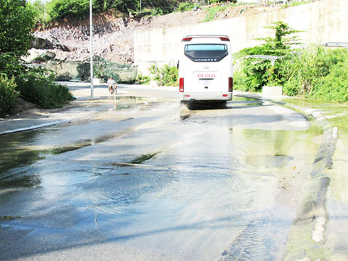 Đường vòng Núi Chụt - Võ Thị Sáu, đoạn sát với đường lên khu biệt thự Ocean View, (TP. Nha Trang) có một đoạn dài khoảng 50m, cứ sau mỗi trận mưa, nước trên núi kéo theo bùn, cát lại tràn qua mặt đường.