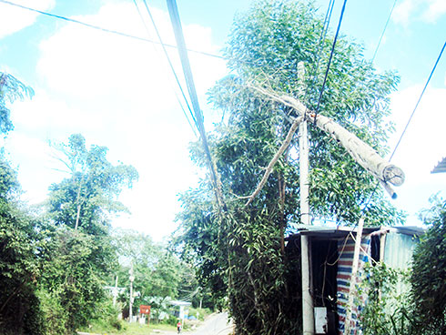 Hiện nay, trên Tỉnh lộ 2, đoạn cách trung tâm thị trấn Khánh Vĩnh, huyện Khánh Vĩnh khoảng 1km có cành cây khô nằm treo lơ lửng đè lên dây cáp viễn thông (ảnh), gây mất an toàn.