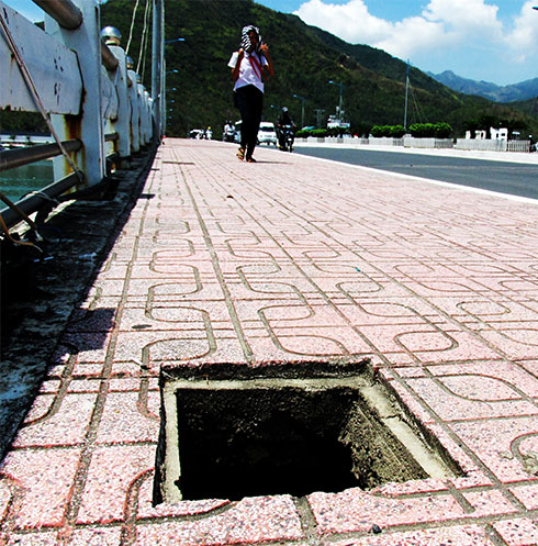 Hiện nay, hai bên hành lang đi bộ trên cầu Bình Tân, TP. Nha Trang có khoảng 10 nắp hố bằng gang bị kẻ gian lấy cắp, để lộ ra hàng loạt hố nguy hiểm (ảnh).