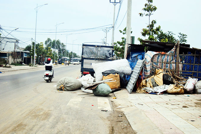 Hiện nay, trên đường Phong Châu, xã Vĩnh Thái, TP. Nha Trang, có hộ kinh doanh, buôn bán phế liệu dựng ván tôn, che bạt, để các bao phế liệu chiếm vỉa hè, lòng đường (ảnh), gây cản trở giao thông và mất vệ sinh môi trường, mỹ quan.