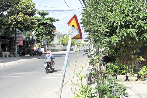 Hiện nay, tại ngã ba đường Trần Khát Chân - Triệu Quang Phục, phường Vĩnh Hòa, TP. Nha Trang có trụ và biển báo giao thông bị đổ ngã nằm trên lề đường...