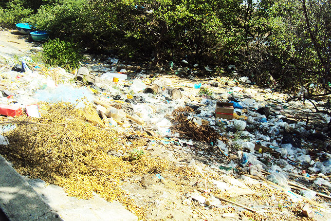 Hàng ngày, nơi bờ kè gần cầu Hiền Lương, thị trấn Vạn Giã, huyện Vạn Ninh, người dân có thói quen vứt bỏ rác, vỏ sò, bao ni-lông bừa bãi, gây dơ bẩn, ô nhiễm nguồn nước và mất vệ sinh môi trường, mỹ quan khu vực bờ kè.