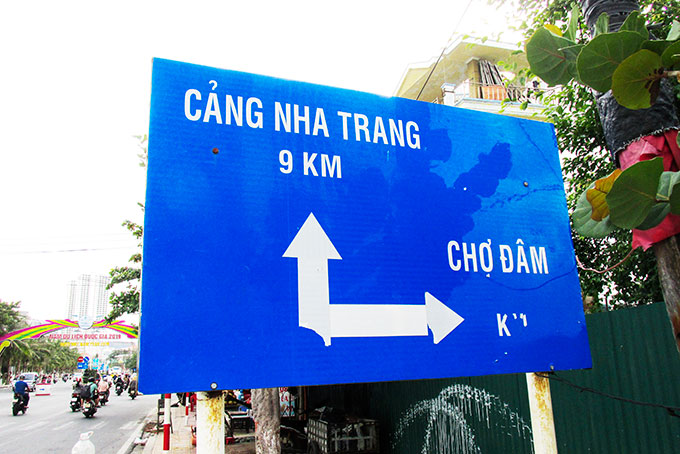 Tại ngã ba đường Trần Phú - Nguyễn Bỉnh Khiêm, TP. Nha Trang có lắp đặt biển báo giao thông chỉ dẫn hướng đi và quãng đường đến cảng Nha Trang và chợ Đầm. Tuy nhiên, hướng đi chợ Đầm lại bị mất thông tin khoảng cách và chữ Đầm bị mất dấu, trông rất khó coi.