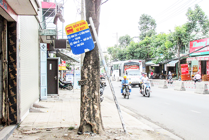 Hiện nay, trên đường Lê Hồng Phong, đoạn tiếp giáp với đường Phòng Không, thành phố Nha Trang có trụ bảng điểm dừng xe buýt bị nghiêng, khuất sau thân cây, làm người đi xe buýt rất khó quan sát.