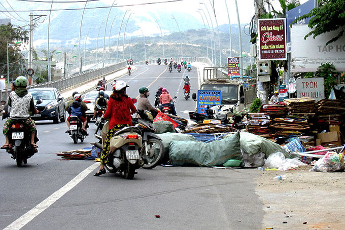 Trên đường Phong Châu, đoạn gần cầu qua sông Quán Trường, phường Phước Hải, thành phố Nha Trang có hộ kinh doanh thường xuyên chiếm dụng vỉa hè, làn đường dành cho xe hai bánh, xe thô sơ để mua bán phế liệu; xe hai bánh, xe thô sơ khi tới đây phải lấn sang làn đường của ô tô nên không đảm bảo an toàn giao thông.