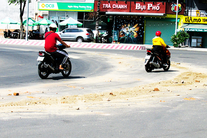 Tại vòng xoay đường Nguyễn Đức Cảnh - Nguyễn Thị Định, phường Phước Long, thành phố Nha Trang, thường có đất đá rơi vãi xuống lòng đường, gây nguy hiểm cho người và các phương tiện tham gia giao thông.