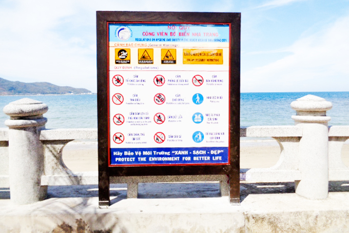 Mới đây, nơi công viên bờ biển Hòn Chồng (đường Phạm Văn Đồng, TP. Nha Trang), có dựng một số bảng nội quy. Trong đó, có cảnh báo khoảng cách bơi an toàn, bãi biển dốc sâu, đề phòng mất cắp, tuân theo hiệu lệnh của lực lượng cứu hộ và cấm tổ chức ăn uống, dẫm đạp lên cỏ, chăn thả gia súc, phóng uế bừa bãi, bán hàng rong…; đồng thời có kèm theo tiếng nước ngoài (ảnh). Việc dựng bảng nội quy như thế này là rất tốt, giúp người dân, du khách ý thức bảo vệ tài sản, an toàn tính mạng khi vui chơi, tắm biển và giữ gìn, bảo vệ môi trường bờ biển xanh - sạch - đẹp.
