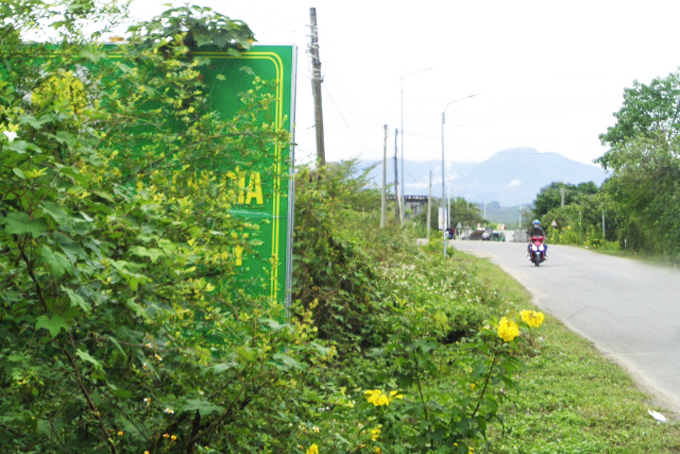 Trên đường liên thôn, liên xã, đoạn gần cầu Đồng Trăng (xã Diên Đồng, huyện Diên Khánh) có dựng bảng tuyên truyền nhưng bị cây xanh mọc cao che khuất.
