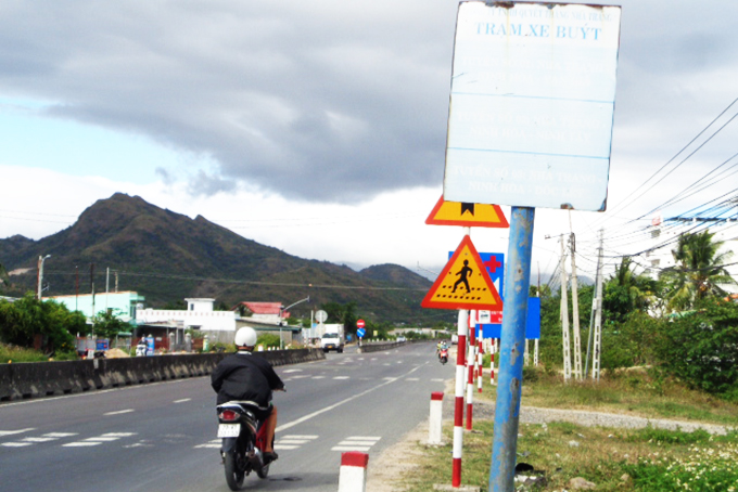 Trên Quốc lộ 1, đoạn qua xã Ninh An (thị xã Ninh Hòa) và xã Vạn Hưng (huyện Vạn Ninh) có một số bảng điểm dừng trạm xe buýt bị bong tróc, mờ chữ, khó quan sát.