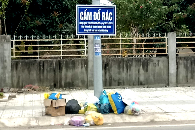 Trên Tỉnh lộ 2, đoạn đối diện Trạm Y tế xã Diên Lạc (huyện Diên Khánh) có dựng bảng cấm đổ rác nhưng một số người dân thiếu ý thức vẫn bỏ rác nơi đây.