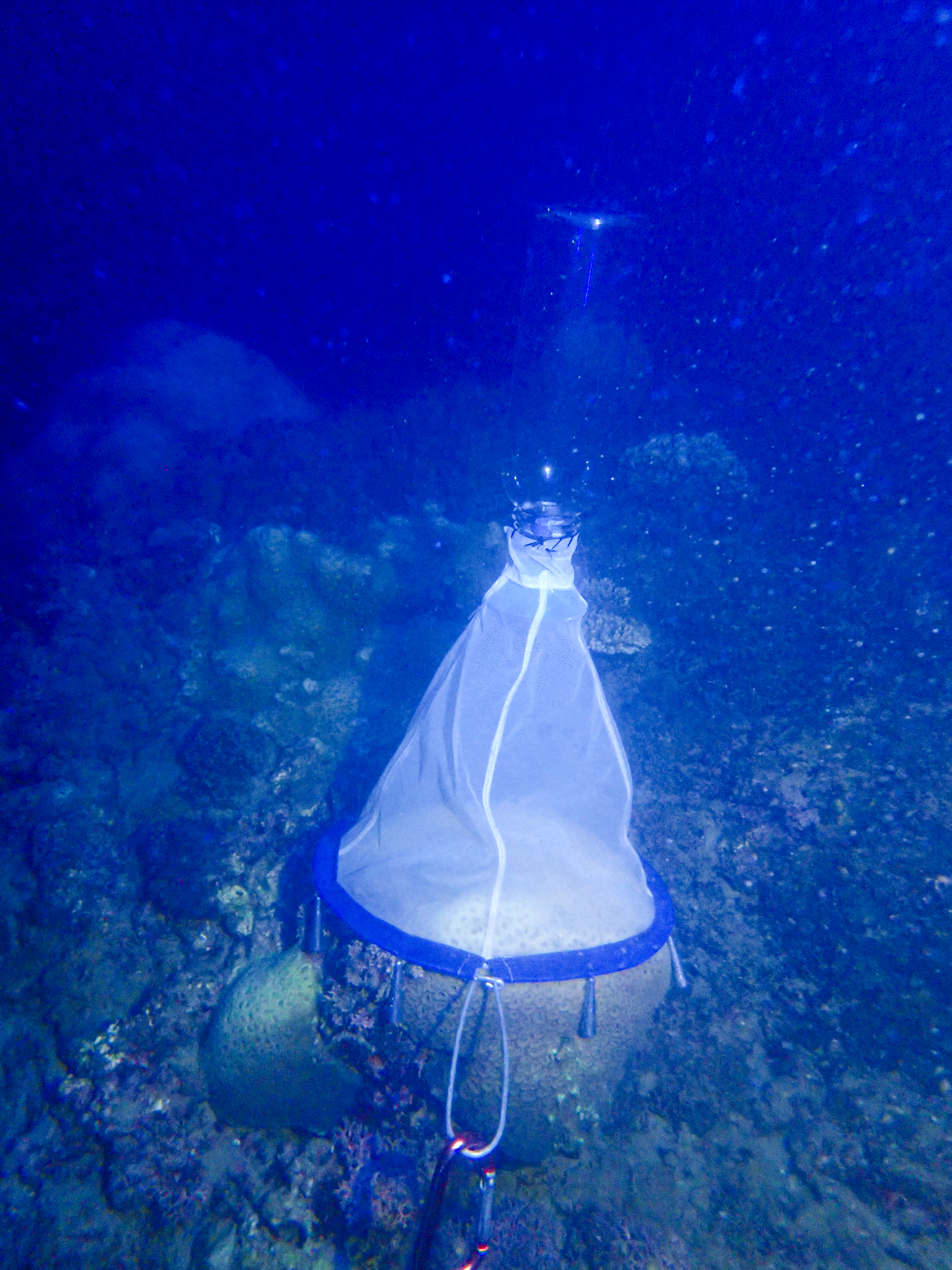 | Giao tử san hô được các nhà khoa học lấy mẫu bằng thiết bị đặc biệt. |