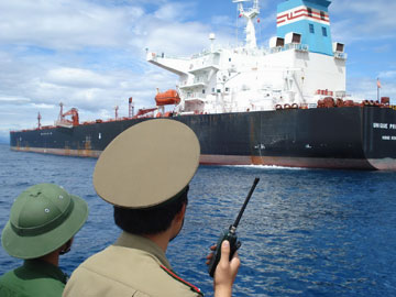 | Bộ đội Biên phòng tỉnh giám sát, bảo đảm an ninh cho tàu dầu Hồng Kông tại vịnh Vân Phong. |