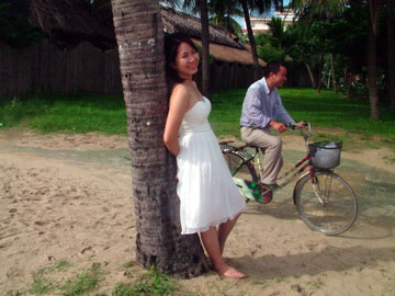 Chuyến đi sáng tác ảnh cưới của các tay thợ ảnh tất nhiên còn có chuyện chọn cảnh tạo dáng bên đám cỏ lau dọc bãi biển, ghé Hòn Chồng lấy cảnh khu nhà cổ, cùng ngồi trên thuyền thúng và cả chèo thuyền… Những cảnh ấy, lên ảnh rất đẹp, cảnh càng hoang tàn càng làm rực rỡ vẻ đẹp của đôi uyên ương. Nhưng có đi chụp ảnh cưới mới biết, cũng mệt như đi… đóng phim.