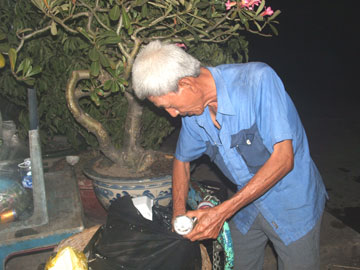 1 giờ 30 đêm. Cơn mưa trái mùa bất chợt đổ xuống làm cho cái lạnh những ngày cuối năm thêm buốt giá. Cuối nhà ga Nha Trang, về phía Tây, dưới làn mưa tầm tã và ánh đèn hiu hắt, thấp thoáng bóng một người đàn ông tóc bạc trắng đang lom khom bới nhặt thứ gì đó từ những bịch ni-lông to tướng mà hành khách trên một đoàn tàu đi qua vừa vứt xuống… Người đàn ông này tên là Trần Khoa Tiên (60 tuổi, tạm trú 31 Thái Nguyên, TP. Nha Trang), làm nghề lượm “ve chai” ở đây gần 20 năm. Sau một hơi thuốc dài căng cả lồng ngực, ông Tiên bắt đầu tâm sự về cảnh đời ngang trái và công việc mưu sinh vất vả của mình… Gần 20 năm trước, do căn bệnh thoái hóa cột sống, không còn khả năng làm những công việc nặng, ông Tiên bắt đầu đến đây lượm ve chai bán lấy tiền phụ vợ trang trải cuộc sống gia đình và nuôi con ăn học. Nhưng 7 năm trước, vợ chồng ông chia tay, 2 đứa con theo mẹ, một mình ông đi thuê nhà trọ gần Ga Nha Trang để tiện mưu sinh. Suốt những năm qua, ngoài những hôm đau ốm, không kể nắng hay mưa, ngày nào, ông Tiên cũng có mặt ở ga từ 4 giờ 30 chiều để nhặt vỏ lon bia, nước ngọt, túi ni-lông, giấy vụn và những thứ có thể bán được. Cứ đến 2 giờ sáng hôm sau, ông mang theo “thành quả” trở về phòng trọ, ăn uống qua loa, rồi tranh thủ chợp mắt sau gần một đêm thức trắng mưu sinh. Đến 8 giờ sáng, ông mang những thứ nhặt nhạnh được đi bán cho vựa thu mua phế liệu trên đường Đồng Nai (phường Phước Hải, TP. Nha Trang). “Hồi mới vô đây kiếm sống, vì vấn đề an ninh trật tự, tôi thường “được” các anh bảo vệ “để mắt”. Nhưng qua một thời gian, biết được hoàn cảnh khó khăn của mình, hơn nữa thấy mình là người đàng hoàng, sau khi bới tìm phế liệu đều cột lại những túi ni-lông gọn gàng, nên họ thông cảm để cho mình kiếm sống. Mỗi đêm, tôi kiếm được từ 20 - 50 nghìn đồng; trừ chi phí thuê phòng, ăn uống, cũng tiết kiệm được chút ít cho đứa con gái đang học cấp 3 và dành dụm…” - ông Tiên tâm sự. Theo ông Tiên, làm nghề lượm ve chai ở đây, ngoài ông còn có một cụ già hơn 70 tuổi. Người này cũng sống độc thân, hoàn cảnh rất éo le và chỉ đến ga vào ban ngày.