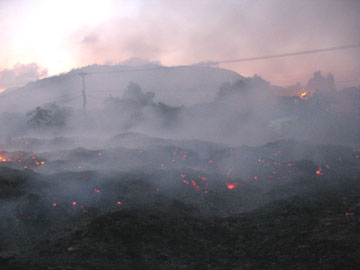 | Bãi mùn cưa tại thôn Phước Điền đang cháy (ảnh chụp lúc 18 giờ ngày 15-3-2010). |