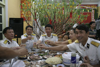 Đến khu vực hậu cần của các chiến sĩ trên đảo Song Tử Tây, không khí đón Tết của lính đảo cũng rộn ràng không kém. Ở đây, chúng tôi bắt gặp hình ảnh các chiến sĩ đang loay hoay mổ gà, mổ heo để chuẩn bị cho bữa cơm giao thừa. Trong khi đó, ở phía trên hậu trường, một nhóm chiến sĩ khác đang gắn những tấm pano, chùm đèn nhấp nháy đủ màu sắc lên cây phong ba được đặt sẵn từ trước. Thiếu úy Lê Văn Chinh cho biết: “Vì đợt này không có cành mai, đào nên đơn vị chọn cây phong ba đẹp nhất đảo để gắn đèn sáng nhấp nháy cho có không khí ngày Tết”. Quả thật, tuy không có nhành mai, cành đào, nhưng qua bàn tay khéo léo của những người lính đảo, căn phòng nơi tổ chức đêm giao thừa cho chiến sĩ và nhân dân trên đảo bỗng đẹp rạng ngời. Trong những thời khắc cuối cùng của năm cũ, đêm 31-12-2010, buổi tiệc chào đón năm mới cho các chiến sĩ và người dân trên đảo bắt đầu. Trong không khí vui vẻ, đầm ấm, mọi người cùng nâng ly chúc nhau những lời chúc với hạnh phúc tràn đầy. Chúng tôi - những người khách từ đất liền đã may mắn có được những giây phút đón năm mới đầm ấm, vui tươi với các chiến sĩ và người dân trên đảo Song Tử Tây.