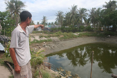 | Ông Nguyễn Cao Công, thôn Nước Ngọt bên ao tôm bị mất trắng trong mùa mưa bão năm 2010. |