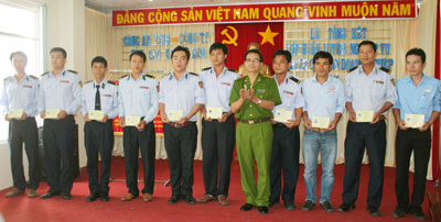 | Để đáp ứng yêu cầu nhiệm vụ, Công ty thường xuyên tổ chức huấn luyện nghiệp vụ bảo vệ cơ quan, doanh nghiệp cho lực lượng tự vệ và bảo vệ (Trong ảnh: Đại diện lãnh đạo Công an tỉnh Khánh Hòa trao chứng chỉ huấn luyện nghiệp vụ cho các đội viên tự vệ). |