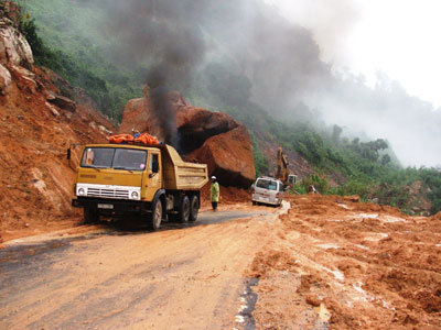 | Tuyến đường Nha Trang - Đà Lạt đoạn qua huyện Khánh Vĩnh bị sạt lở nghiêm trọng trong mùa mưa lũ năm 2010. |