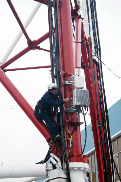 | Cán bộ kỹ thuật Viễn thông Khánh Hòa hiệu chỉnh thiết bị 3G mới trước khi phát sóng. |