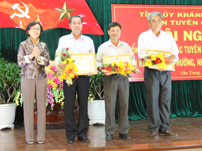 Bà Nguyễn Thị Kiều - Ủy viên Ban Thường vụ Tỉnh ủy, Trưởng Ban Tuyên giáo Tỉnh ủy Khánh Hòa khen thưởng các tập thể có thành tích xuất sắc trong công tác tuyên giáo năm 2012. |