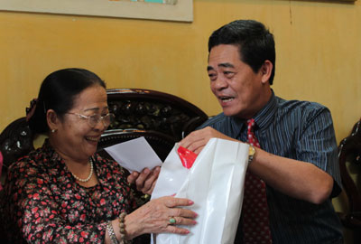 | Ông Nguyễn Tấn Tuân tặng quà cho gia đình ông Lê Thanh Liêm - nguyên Bí thư Tỉnh ủy. |